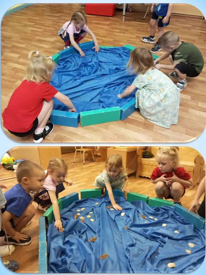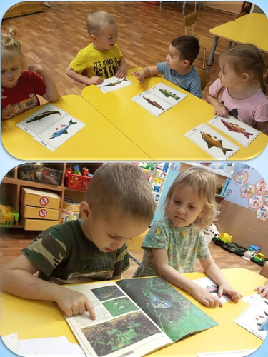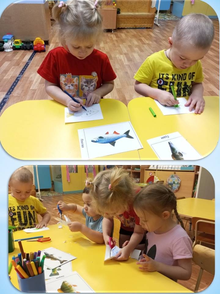 Перед началом игры ребята рассмотрели изображения рыб, которые водятся в наших водоемах, узнали для чего нужен поплавок и крючок на удочке, а потом взялись за работу. С помощью воспитателя изготовили удочки, нарисовали и вырезали рыб, из подручных средств сделали пруд, заселили в него ракушек и рыб, а из пластилина налепили червяков. Теперь можно идти на рыбалку.